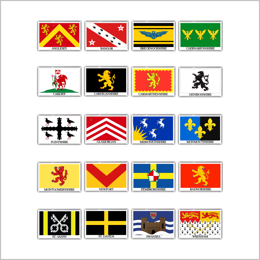 These High Quality Jumbo Size Acrylic Fridge Magnets feature the Flags of the 13 Historic Welsh Counties that existed from 1535 up to their abolition in 1974 and the Flags of the 7 Welsh Cities (see list below).