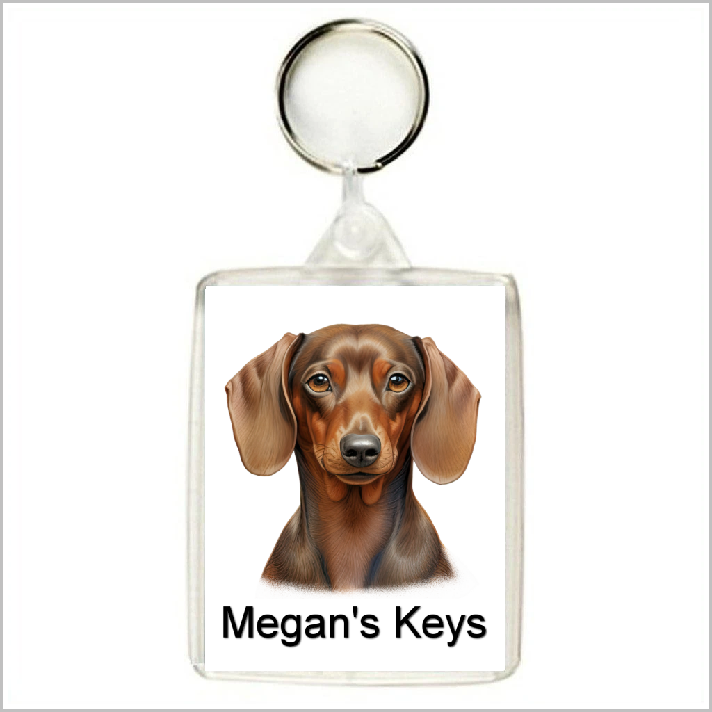These unique custom made High Quality Tough Acrylic Key Rings feature delightful DACHSHUND images on BOTH SIDES and there are FOUR DESIGNS to choose from and they are Personalised with THE WORDING YOU REQUIRE (e.g. Fiona's Bag, Megan Jones etc.)